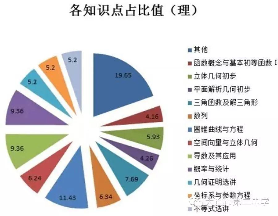 6.概率与统计:2小1大,小题一般主要考查:频率分布直方图、茎叶图、样本的数字特征、独立性检验、几何概型和古典概型、抽样(特别是分层抽样)、排列组合、二项式定理等几个重要的分布;解答题考查点比较固定,一般考查离散型随机变量的分布列、期望和方差,仍然侧重于考查与现实生活联系紧密的应用题,体现数学的应用性。