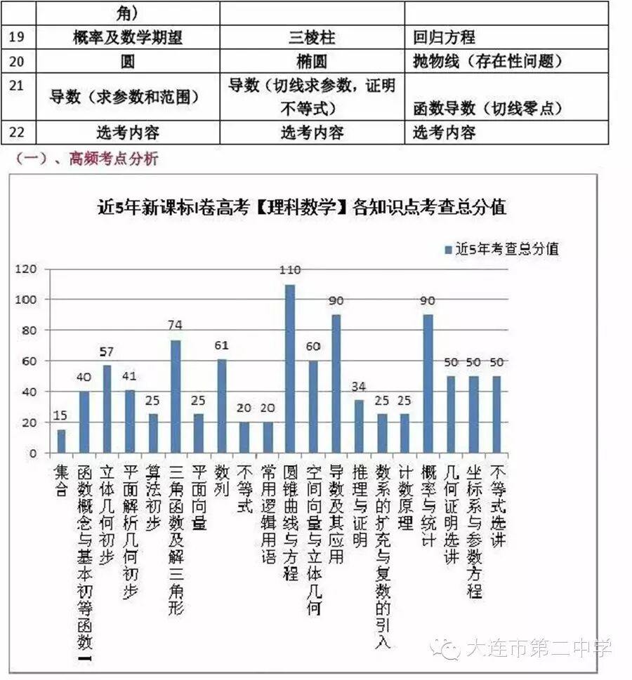 9.选考:几何证明主要考查圆内接四边行、圆的切线性质、圆周角与弦切角等性质、相似三角形、弧与弦的关系、试题分两问,难度不大,图形比较简单,可以考作辅助线,但非常简单; 坐标系与参数方程,主要考查极坐标系与直角坐标系的坐标和方程的互化,在极坐标系下的点与线,线与圆的位置关系;就参数方程而言,主要考查参数方程与普通方程的互化,圆、椭圆、直线参数的几何意义,直线的参数方程在直线与圆锥曲线的位置关系中,弦长、割线长等的计算问题,坐标系与参数方程轮换考或结合起来考;不等式近三年主要考查的是解绝对值不等式,但随着参与新课标全国卷的省份的增加,也会考查比较法、综合法和分析法等不等式方法,但柯西不等式、排序不等式等还不会在新课标全国卷里考。